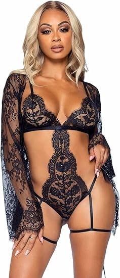 • This lace garter thong teddy and robe lingerie set for women by Leg Avenue is a sensual piece that inspires desire.