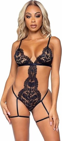 • The luxurious lace garter thong teddy features a deep neckline that accentuates the cleavage at the front and cheeky coverage for the derriere at the back.