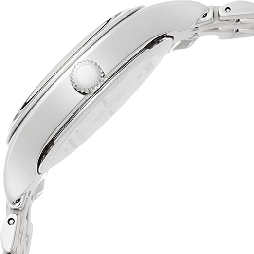 The white dial is enhanced by silver hands. Silver stainless steel case with silver stainless steel strap. Quartz movement. Water resistant to 30 meters/100 feet. Fixed bezel. Scratch resistant sapphire crystal. Solid caseback. Deploy using button buckles. Pull/push crown. Case dimensions 27mm x 7.73mm. With 12mm x length. Tissot T103.110.11.033.00 Bella Ora watch.
